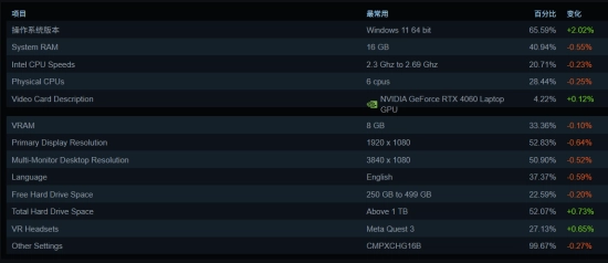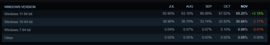 在 Windows 系统方面,11 月 Steam 平台的 Windows 11 占比继续攀升 2.18%,份额提升到了 69.2%;Windows 10 则下滑了 2.17%,份额为 30.66%。