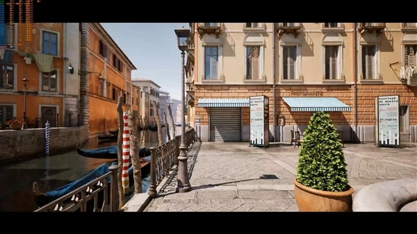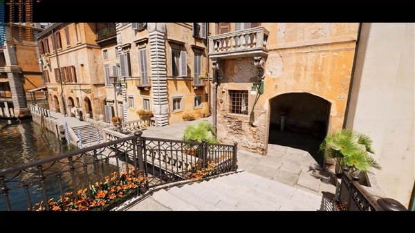 Demo使用了超过 500 个资产构建,精致还原了威尼斯极具地方特色的建筑、街道和桥梁,包括晾晒着衣物的庭院和充满花卉的咖啡馆等生活场景。