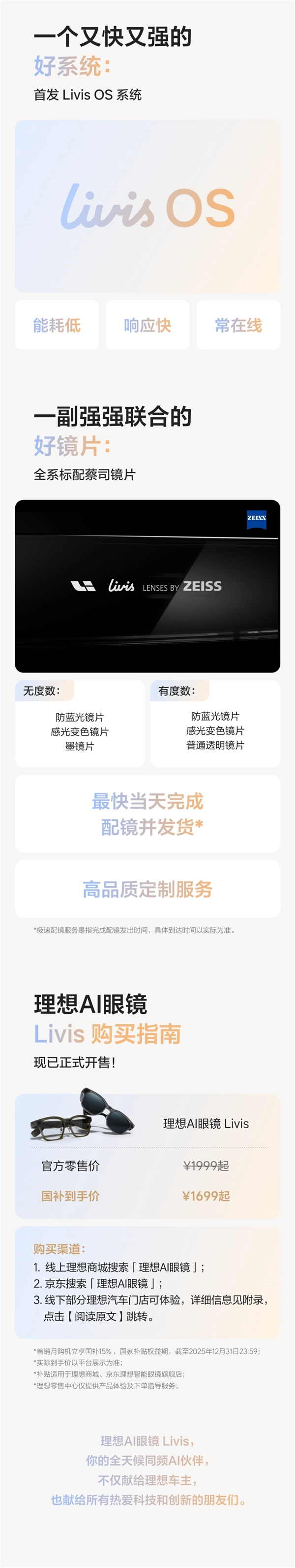 理想汽车近期正式推出AI智能眼镜Livis,其售价1999元起,若在12月31日前下单购买,价格则1699元起。