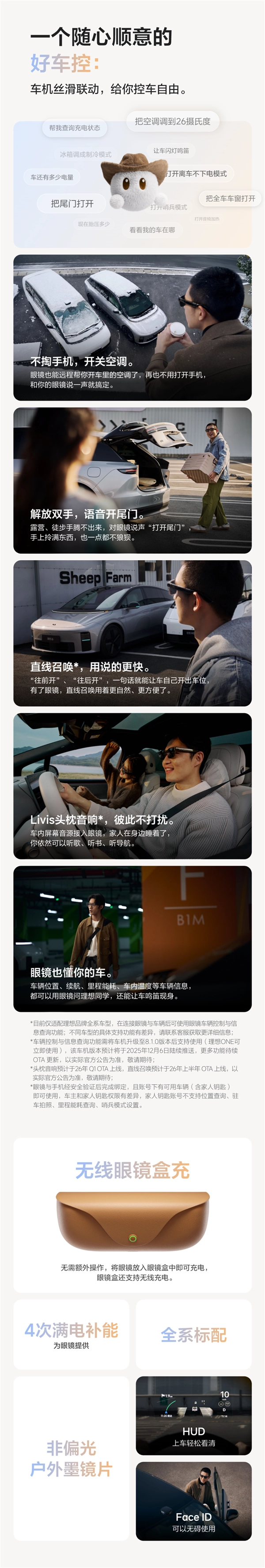 同时,这款眼镜能与理想车机联动并实现车辆操控,涵盖直线召唤、后备厢开关、侧滑门控制、空调开启以及方向盘加热等功能,而且全系都标配了无线眼镜盒充电装置,让充电过程变得极为便捷。