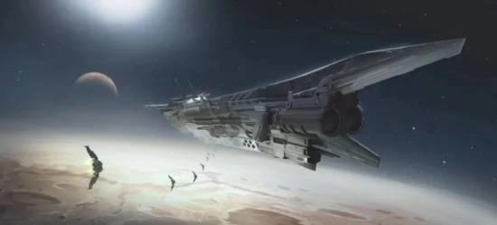 画面中展现了巨大的宇宙飞船漂浮在荒芜行星的上空。