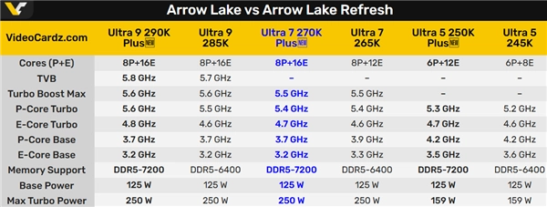 另外,内存频率均从DDR5-6400提升至DDR5-7200,而热设计功耗保持不变。