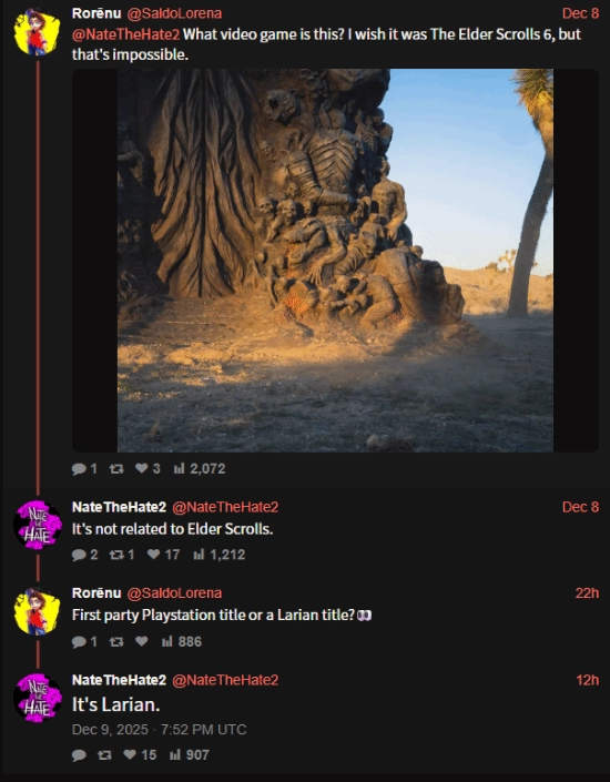 今日,知名舅舅党NateTheHate针对TGA的神秘雕像做出回应,称其为拉瑞安的作品。
