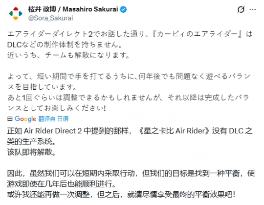 樱井政博在推文中说明,因为团队即将解散,他们现阶段的目标是借助平衡性调整,保证游戏在未来几年里都能让玩家安心游玩。据了解,《星之卡比:飞天骑士》的Ver1.2.0版本更新已经正式推出,其中涵盖了大量错误修复、体验优化以及平衡性调整内容。
