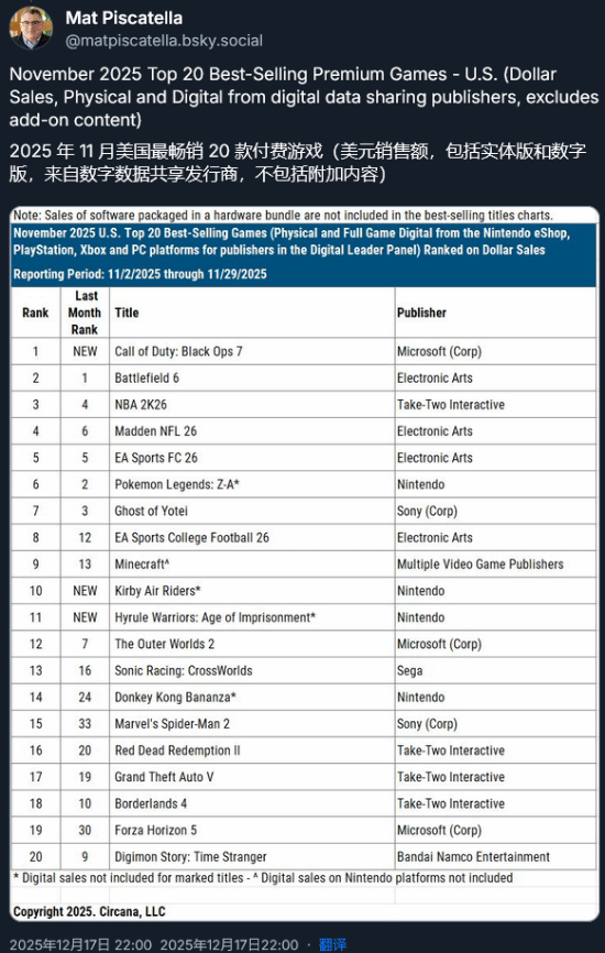根据Insider Gaming的报道,市场调研机构Circana的分析师Mat Piscatella对外发布了2025年11月美国游戏市场的销量数据,在这份数据中,《使命召唤22:黑色行动7》凭借出色表现超过《战地6》《NBA 2K26》等热门大作,占据销量榜首位置。