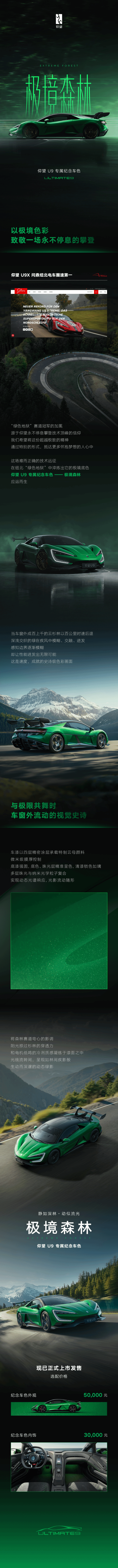 今天,仰望U9的专属纪念色“极境森林”正式上市,其售价为188万元。此前仰望U9提供紫色、红色、银色三种车身颜色选择,所有颜色版本的售价均为180万元;此次新增的“极境森林”绿色为选配颜色,需额外支付8万元(其中外观部分5万元,内饰部分3万元),选择该颜色后的车辆总价为188万元。