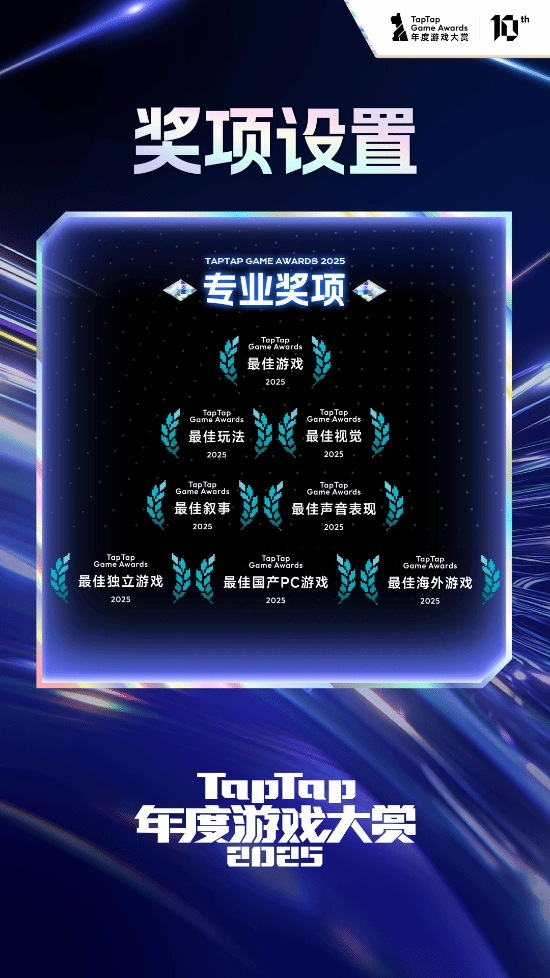 在第十届这一重要年份,2025 TapTap年度游戏大赏在评选机制与参与方式上继续升级。今年大赏共设立16项年度奖项,包括8个专业奖项与8个玩家奖项,在专业奖与玩家奖中均新增了PC游戏相关奖项,TapTap年度游戏大赏不再仅聚焦移动端,而是面向更广泛的游戏生态。