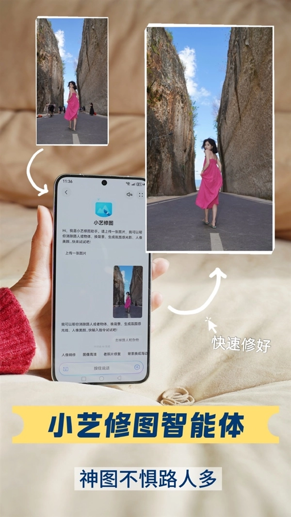 旅途中拍的照片,只需说“消除背景路人”“把天空换成晚霞”,小艺对话式修图功能就能快速实现,无需专业修图技巧就能拥有人生照片。