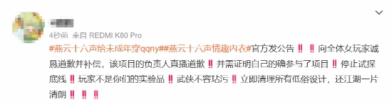 而到了晚上写稿的时候,“燕云十六声情趣内衣”与“燕云十六声相关补偿”这两个话题又登上了微博热搜。实际上,这几天《燕云》差不多一直都在热搜榜上,相关的舆论讨论至今也还没有平息。