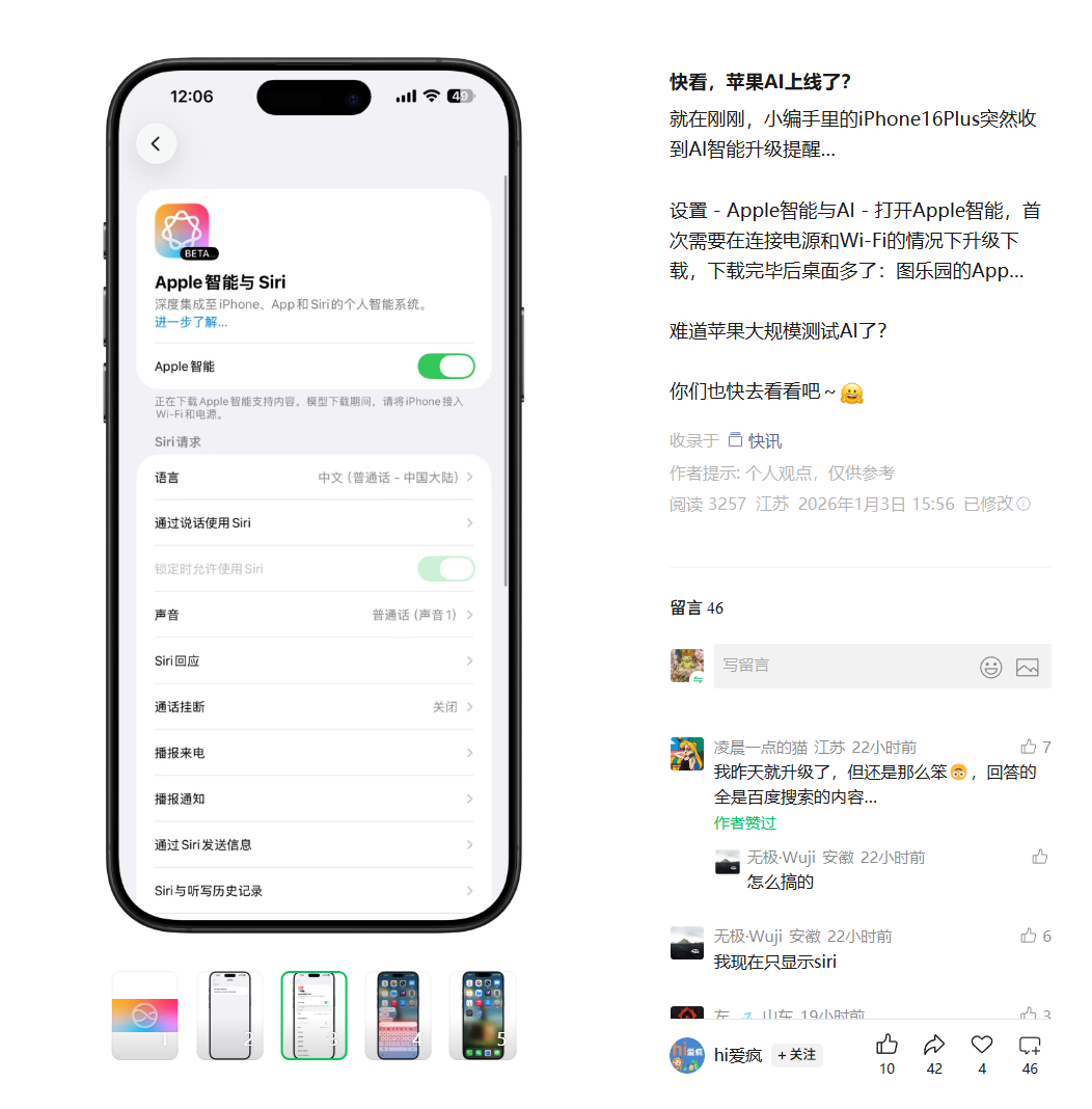 1月4日上午“国行苹果AI灰测”的热搜持续刷屏,众多网友反馈自己的国行iPhone 16 Plus收到了“Apple智能与Siri”的测试提示,更有博主分享了相关解锁教程。