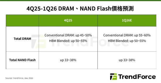 以下是关于2026年第一季度DRAM内存与NAND闪存价格走势的预测内容: