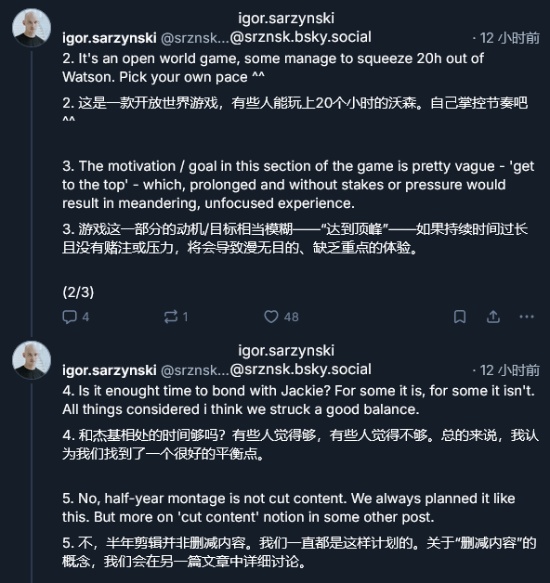 “我并不否认‘拯救自己’与‘去干别的乱七八糟的事’之间存在的玩法叙事失调,如果让我重来一次,我会重新为委托和支线任务赋予语境,把它们解释为另一种逃离死亡的方式——通过创造属于你自己的传奇。甚至可能会把某个特定结局,锁定在完成足够多支线内容之后。”