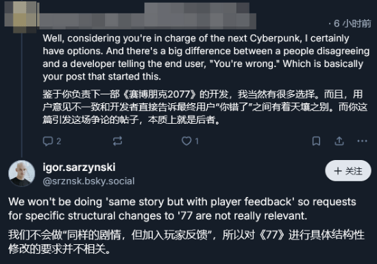 同时,他也非常明确地表示:无论玩家提出建议的动机是否善意,CD Projekt对自己要做什么已经有了相当清晰的认知。“我们不会去做‘同一个故事,然后只是加上玩家反馈’这种事情。所以,针对《赛博朋克2077》提出的具体结构性修改建议,其实并不太相关。”