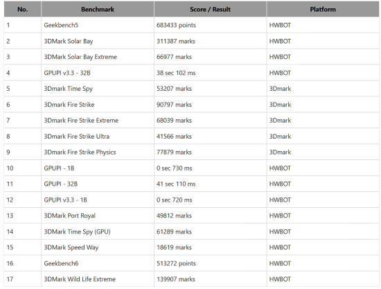 凭借 MSI 毫不妥协的硬件工程和极致的超频设计,GeForce RTX 5090 LIGHTNING 凭借特制 XOC BIOS 与液氮散热,创下了 3742 MHz 的核心频率纪录,峰值功耗甚至突破 2500W,在 17 项超频基准测试中均名列第一,并在 HWBOT 和 3DMark 上打破了多项记录,详情如下表所示: