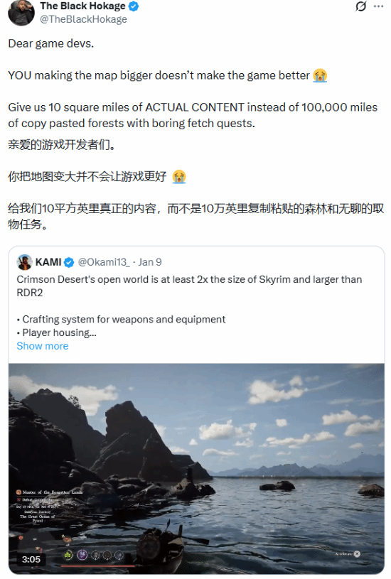 尽管Pearl Abyss承诺地图会布满活动内容,部分玩家仍有顾虑。玩家TheBlackHokage率先表达担忧,他在推特上写道:“地图大不代表游戏好。与其做10万平方英里的重复场景和无聊任务,不如给10平方英里的优质内容。”