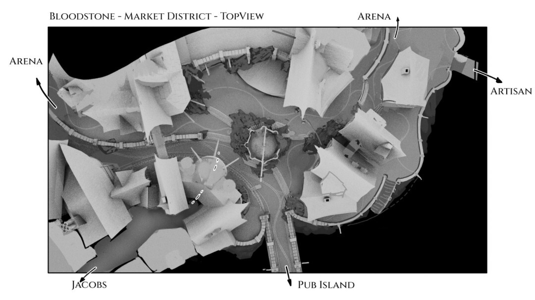 在概念设计图里,最令人惊喜的部分要数曾在《神鬼寓言2》中登场的Bloodstone将在新作里回归——这座笼罩着阴郁氛围的港口城市,过去是罪犯与海盗的藏身之所。概念图呈现出这座城市的庞大体量,涵盖了市场区、竞技场、工匠区,甚至还有一家“岛屿酒馆”。从图中的细节能看出,想要进入这座城市,似乎得先穿过一座藏在群山之中的城堡。