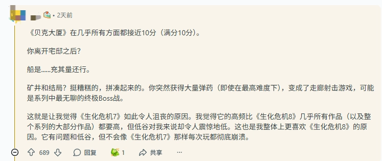 评论区,许多玩家表达了自己的看法。有玩家表示:“对我来说,贝克宅邸那一段几乎是10/10,各方面都接近完美,但离开宅邸之后,船那一段最多只能算还行,而矿坑和结局则真的很糟,感觉像是匆忙拼凑出来的——你突然获得大量弹药(即使在最高难度也是如此),游戏变成了走廊射击,最终Boss战可能是整个系列里最无聊的一个。这也是为什么《生化危机7》让我如此纠结:它的高光时刻甚至比《生化危机8》或整个系列里的许多作品都要出色,但低谷又低得惊人。而相比之下,我更喜欢《生化危机8》,虽然也有问题和低点,但它不会像《生化危机7》那样在后期每次玩都明显失控和崩盘。”