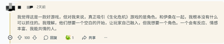 也有玩家阐释道,《生化危机7》是一款不错的游戏,但真正让《生化危机》系列吸引人的,是角色本身。而对于伊森,自己完全抓不住他的亮点。自己想要的是一个有血有肉的角色,一个会有反应、会有情感、让玩家能够产生共鸣的人物。