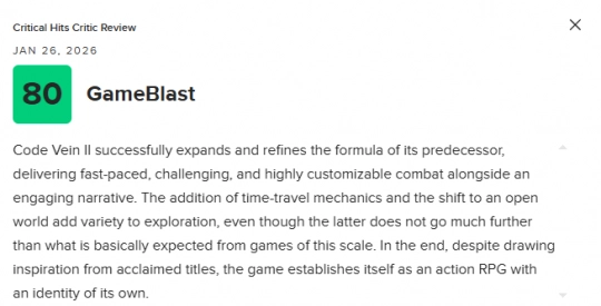《噬血代码2》在前作基础上成功扩展并打磨了核心玩法,带来了节奏更快、挑战性更强、且高度可定制的战斗系统,同时也讲述了一段引人入胜的剧情。时间穿越机制的加入,以及向开放世界结构的转变,为探索过程增添了更多变化,尽管后者的发挥并未明显超出同体量作品的常规水准。总体而言,尽管本作从多款口碑佳作中汲取灵感,但依然确立了自身鲜明的动作RPG定位与独立个性。