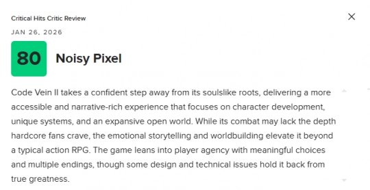 《噬血代码2》自信地迈出了远离类魂系根源的一步,带来了一种更易上手、叙事比重更高的游戏体验,重点放在角色塑造、独特系统以及更加广阔的开放世界上。尽管其战斗深度可能无法完全满足硬核玩家的期待,但情感充沛的叙事方式与扎实的世界观构建,使其整体表现超越了一般的动作RPG。本作强调玩家自主性,通过具有分量的选择与多重结局增强代入感,不过部分设计与技术层面的问题,也让它距离真正的“伟大之作”仍差临门一脚。