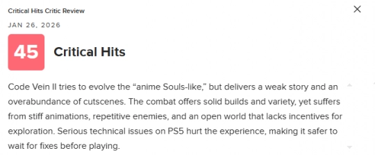 《噬血代码2》试图进化“二次元类魂”这一定位,但剧情表现乏力,过量的过场动画反而拖慢了节奏。战斗系统在配装构筑和玩法多样性上仍有亮点,却受限于生硬的动作演出、重复度偏高的敌人设计,以及缺乏探索动力的开放世界。PS5版存在较为严重的技术问题,明显影响整体体验,更稳妥的选择或许是等待后续修复后再入手。