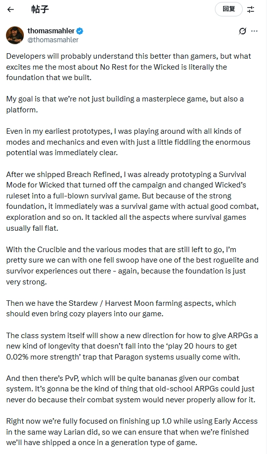 近日,《恶意不息》的开发工作室Moon Studios的首席执行官托马斯·马勒(thomasmahler)在推特上发布了一篇长文,他表示自己的目标不只是打造一款出色的游戏,更在于建立一个游戏平台。