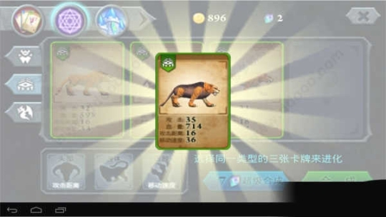 接着点击上面多面体紫球,进行合成,左边三个选项卡是三个属性分类,第一个是直立行走的动物,第二个是爬行动物,第三个是飞行动物,因为每次合成至少要三个动物,并且这三个动物必须属于同一种类型,所以我们先来合成老虎犀牛老虎。