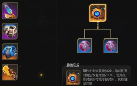 第五件装备是更新球,它能增加一秒的生命恢复和魔法技能恢复,并缩短超级技能的冷却时间。这个装备由两个复原之球合成,操作十分简单。笔者认为这件装备非常适合剑客使用,可以实现持续旋转而毫无压力。