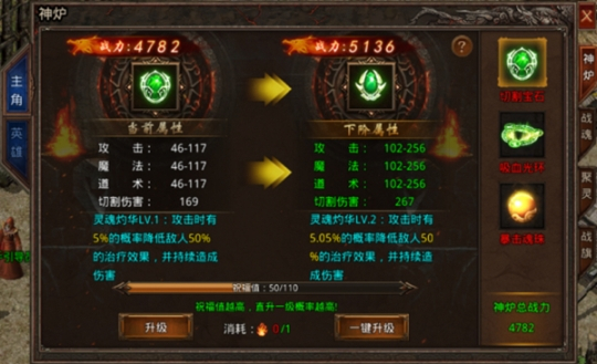 玩法介绍:对神炉进行升级,获得大量属性,如果升级失败会获得祝福值,祝福值越高神炉升级概率越高,法宝同时到达一定等级后可以激活一个阵法特效,法宝等级升级后阵法特效也会随之变化。