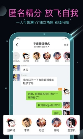 2、聊天消息:随时随地收发好友和群消息,—触即达。不仅可以自己和自己换身份