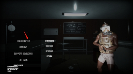 1、进入scum人渣手机版国际版,等待几秒进行游戏加载,然后正式进入游戏首页,点击单人游戏,里面提供了游戏演示、继续和新游戏,我们点击开始演示;