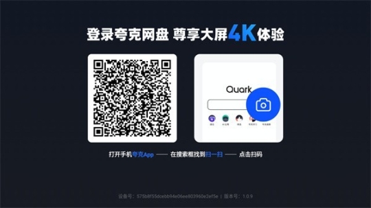 1、在本站下载并安装夸克网盘TV版后,初次使用需要使用已登录账号的设备扫描屏幕上的二维码