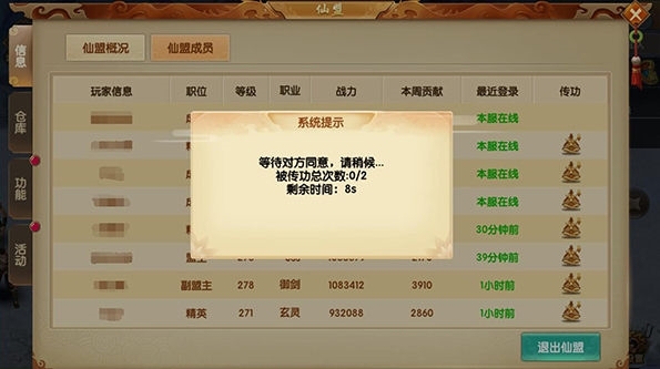 当被邀请进行传功指导会出现系统提示,并显示剩余被传功次数,10秒内如未接受,则自动拒绝指导