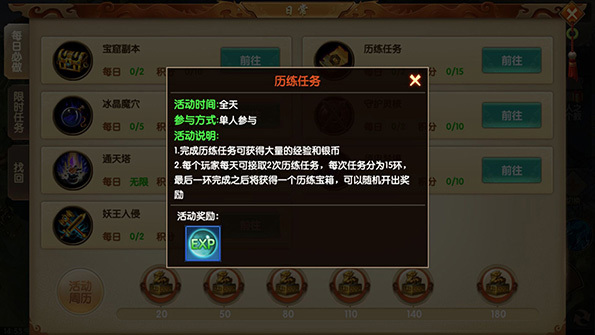 奖励内容:海量经验值奖励、银币奖励、历练宝箱(奖励随机)。