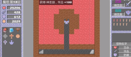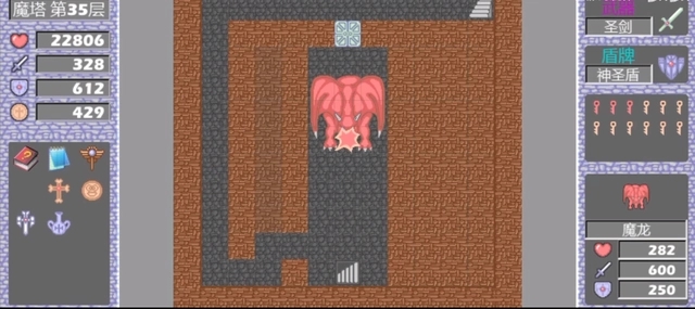 5F:向上打绿色史莱姆[L=828,G=11],向右打绿色史莱姆[L=804,G=12],向下打红色史莱姆[L=754,G=14],开门拿剑[L=754,A=20,D=10,G=14]。向上打红色史莱姆[L=734,G=16],不过门,回到中路打蝙蝠拿钥匙[L=678,G=19],下楼。