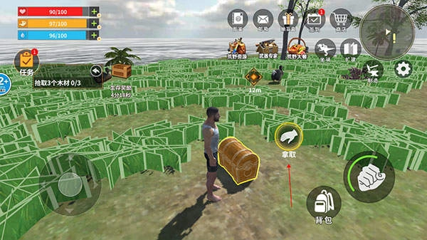 3、位于左上角的三条颜色条,分别代表生命值、饥饿值以及水分。只有维持足够的数值,才能保证正常生存。