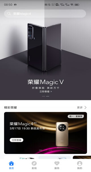2、点击“发现”,你可以在此搜索与荣耀产品相关的帖子。