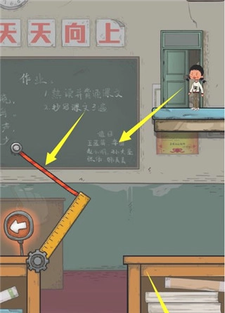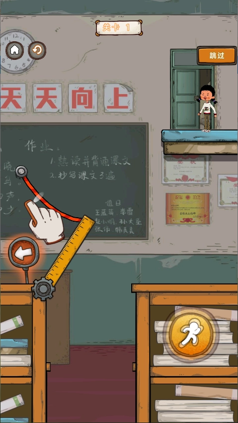 关卡1:点击红色绳子,尺子放下来后,点击右下的奔跑图标
