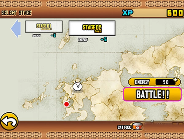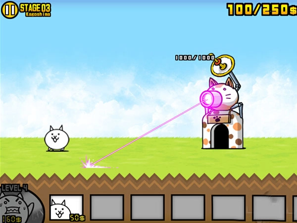 3、点击BATTLE!!之后就进入游戏了,游戏界面如下,那个奇怪的柱状物就是我们的老家了,我们的任务就是守护老家。那些汪星人就是我们的敌人,我们需要做的就是等右上角的钱数增长以后开启左下角的按钮让塔里的猫咪能力更强或者生产喵星人。游戏初期可以选择的喵星人兵种很少,只有这一种,后期会有很多不同类型的喵星人,而敌人的类型也会增多,小蛇大猩猩神马的应有尽有。如果敌人直接压到我方塔下我们的塔的生命就会减少,到零的时候就会GAMEOVER。