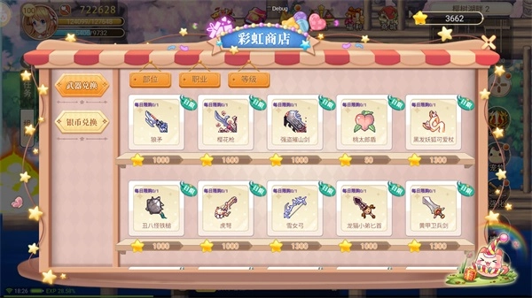 彩虹商店主要包含两个部分,分别是武器兑换与银币兑换。在武器兑换板块,玩家能够凭借星币来兑换稀有品质的武器;而银币兑换部分,则允许玩家使用银币购买药水。