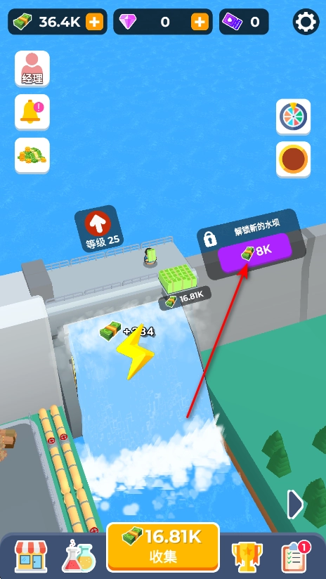 2、分别升级大坝的每个部分,以增加你的收入;