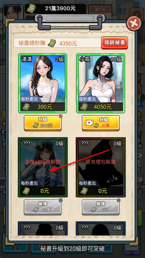 2、解锁条件就是将上一个秘书升到十级