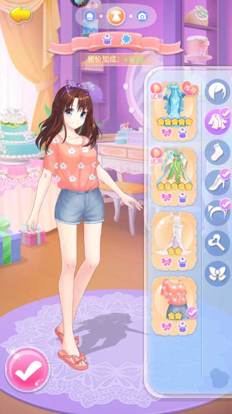 玩家需点击小店门口旁边类似镜子的图标。选定蛋糕种类后,开始装扮自己的服装。最后挑选一个你喜欢的杂志版式即可。