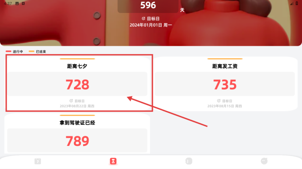 2、切换到倒计时页,查看距离七夕等目标天数,了解重要日期剩余时间,提前准备。