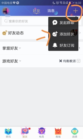 1、首先打开软件,进入到盟友界面,点击右上角的+按钮,选择添加好友。
