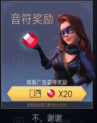 在游戏中选择关卡主题的界面,你会有机会看到一个飘来飘去的气泡包裹着一个音符。点击它,会有弹窗提示你获得了一颗红宝石,而在下方会有激励广告的按钮,并标有本次观看激励广告会获得的钻石翻倍倍数。所翻倍数从2到25不等,依靠运气。