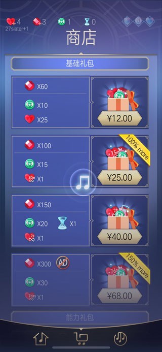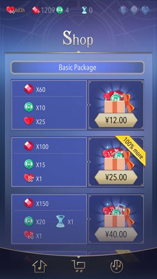 如下图所示,一些礼包中同样含有红宝石,你可以在最下方菜单栏的三个按钮中找到商店界面。¥12的基础包中包含60宝石;¥25的基础包中包含100宝石;¥40的基础包中包含150宝石;¥68的基础包中包含300宝石。