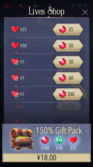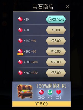 ¥25:100红宝石、15复活道具、30分钟限时无限生命值;
