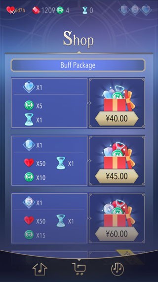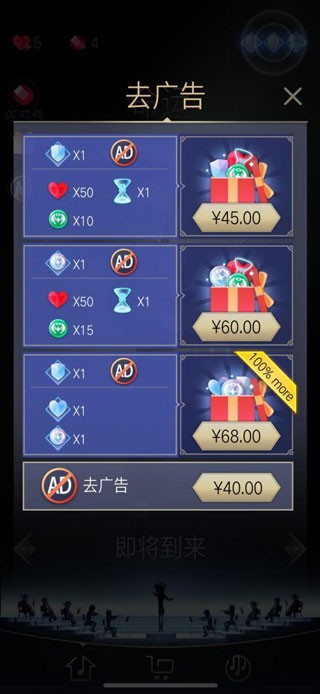 ¥40:每天2小时无限生命值、5复活道具、1魔法沙漏、去除弹窗广告;