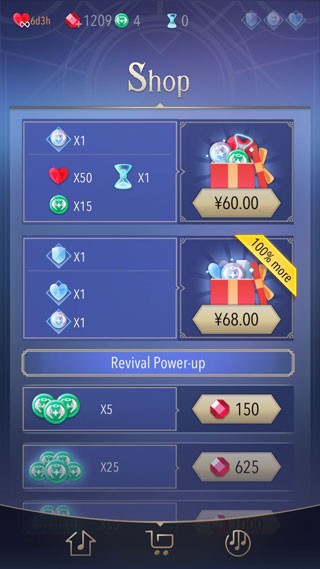 ¥60:50生命值、永久开局首次复活免消耗复活道具、15复活道具、1魔法沙漏、去除弹窗广告;